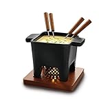 Ceramic black cheese fondue pot and mahogany wood board