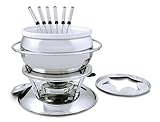 Set comes with 6 fondue forks, pot, splatter guard, ceramic insert for cheese or chocolate, and a fondue burner